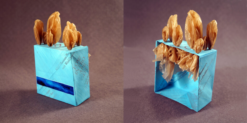 Junk mail, oil paint, plastic grocery bag, acrylic wash
